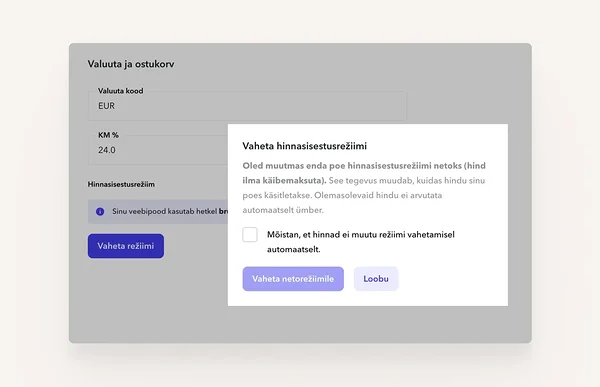 Loe rohkem e-poe hinna haldamine neto- ja brutorežiimi juhendist.