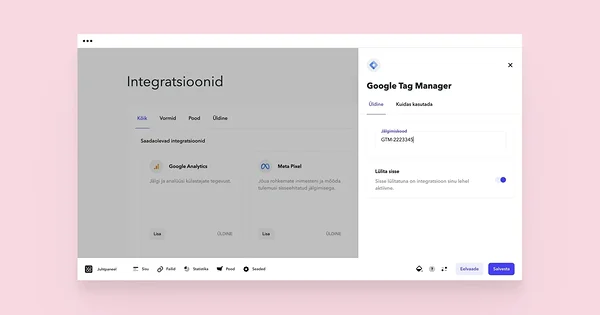 Liigu oma saidile klõpsa all tööriistaribal Integratsioonid. Leia integratsioonide vaatest Google Tag Manager ja vajuta antud sektsioonil. Avanenud aknas sisesta oma konteineri ID vastavasse lahtrisse. Salvesta muudatused.